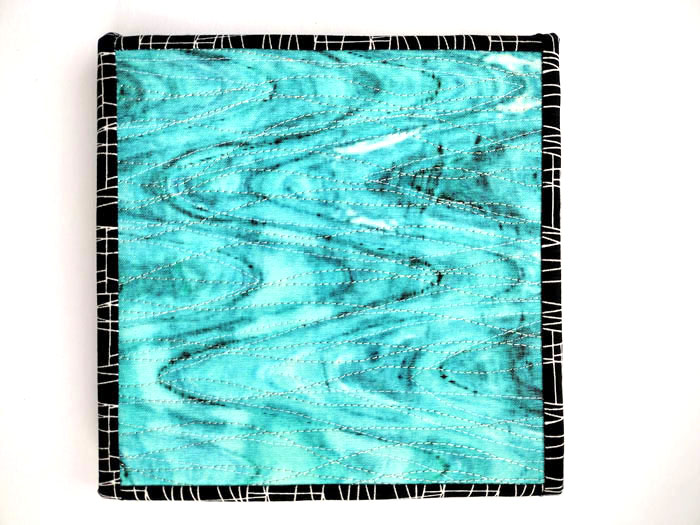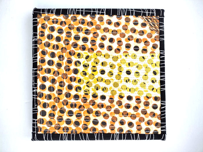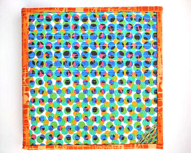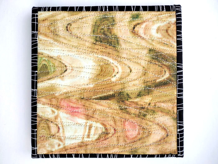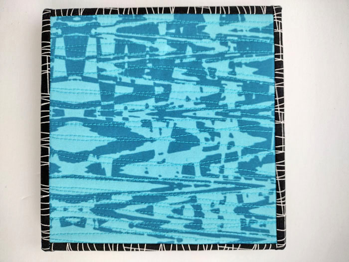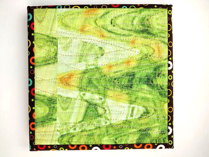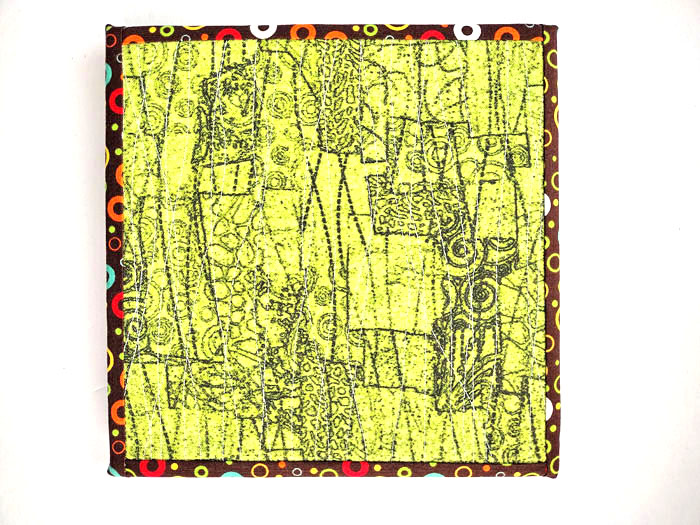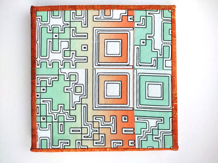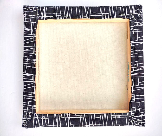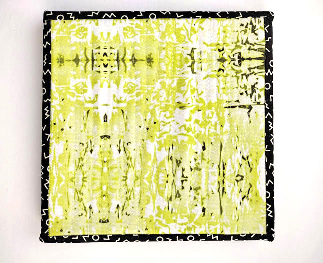 To finish the minis, I cut them down to fit an 8″ square stretched canvas. Then, I attach a complimentary fabric binding and stretch around the canvas. The binding is done by sewing two strips to the top and then two strips to the bottom.