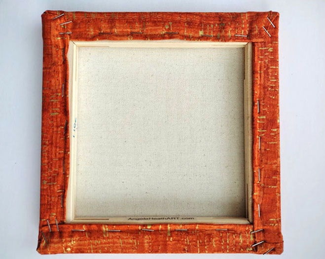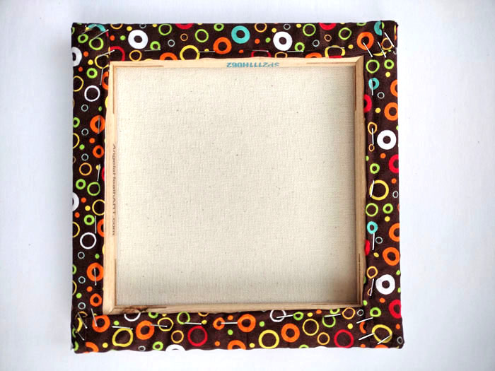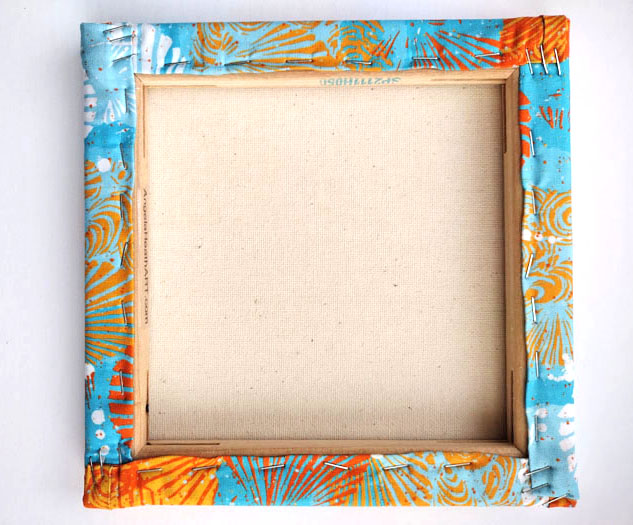 On the back, I fold and staple the excess fabric all the way around the wooden canvas frame. There is no glue used to do this.