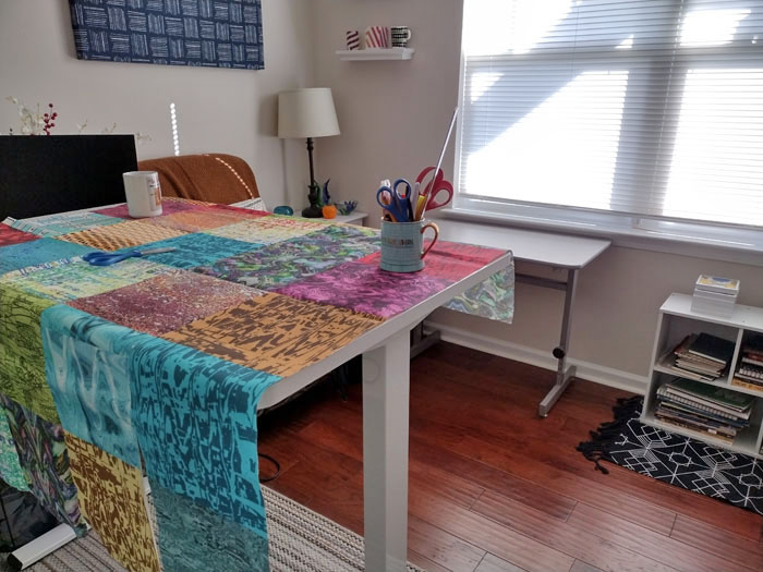 I work with a giant-sized cutting mat on my standing desk. The standing desk allows me the most flexible angles to move the panel and cut the squares out. What I love about the desk is that I can program in the height to work on my minis. It is just the click of a numbered button. In my case, clicking Number 1 brings the desk to normal sitting height. Clicking Number 3 brings it to standing/cutting height. Numbers 2 and 4 are various sitting heights.