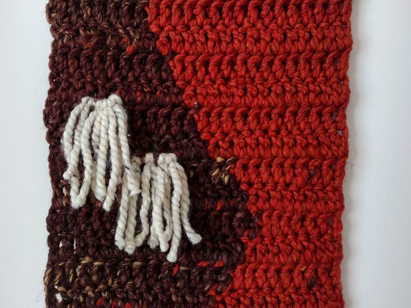 I like the totally improv nature of this piece. It allowed me to practice with the double crochet, color changing, and the fringe inside of the piece. I chose not to do a single crocheted trim around the whole piece. I wanted the colors to bleed to the edges and not be trimmed by a contrasting color.
