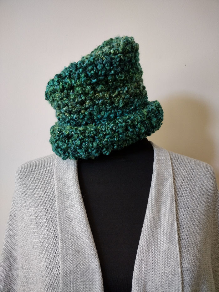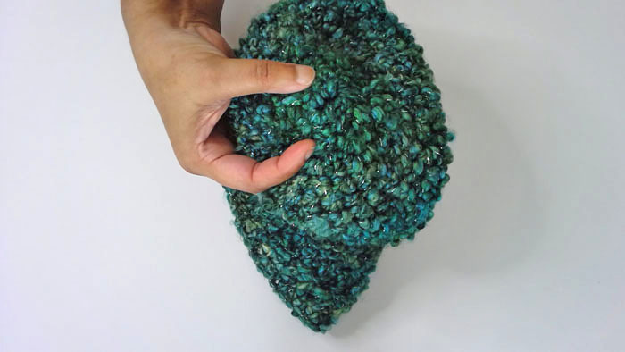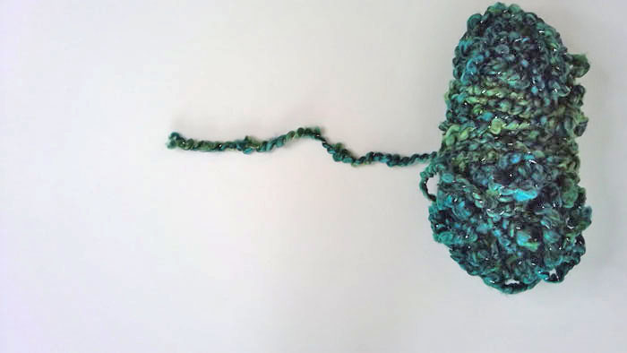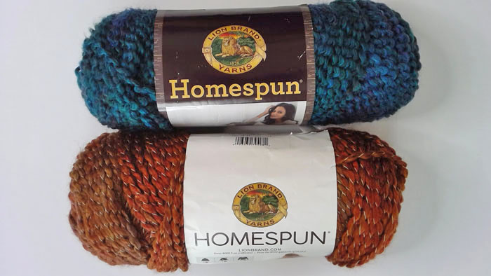 The pattern calls for one skein of a bulky #6 yarn (left pic below). I used one skein of Lion Brand’s #5 Homespun. This yarn is just as bulky and textured with graduated color. The yarn I chose was the turquoise (now discontinued) with glitter string woven throughout (middle pic below). The other color choices are similarly beautiful. Check them out on Lion Brand’s website or at Amazon (right pic below; see Resources). The yarns can be pretty pricey per skein so look for sales.