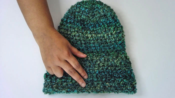 The pattern calls for all single crochet stitches for the top (first pic) and middle (center pic). These sections are followed by double crochet stitches to make up the brim (right pic). A row of single crochet stitching caps it off.
