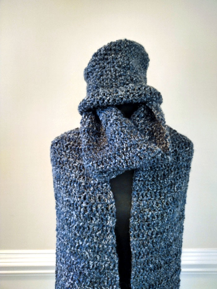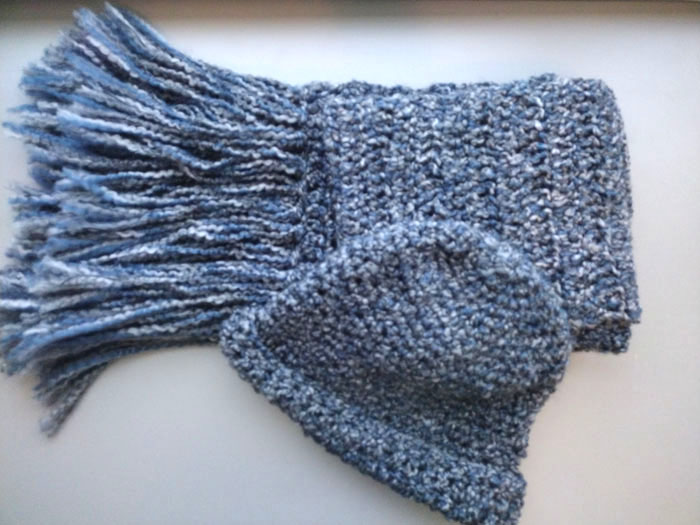 Yarn. The pattern uses Lion Brand’s Homespun Collection (Blue Moon). The hat uses 1 skein (185-yds) of the yarn while the scar uses 2-1/2 skeins of the yarn. The weight is classified as a #5 Bulky. The yarn is a beautifully gradiated blend of very light blue to dark sky blue, curled and twisted.