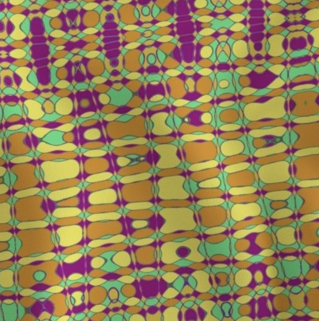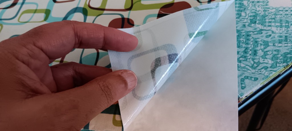 I am in a “Fabric Happy” state of mind! I plan to create two 16″ x 20″ wall hangings. One will have a blue/brown color theme. The other will have a green/gold color theme. Below shows the Heat ‘n Bond adhesive on the back of a retro blue cotton fabric. Then, all the fabrics with the fusible adhesive applied on the backs.