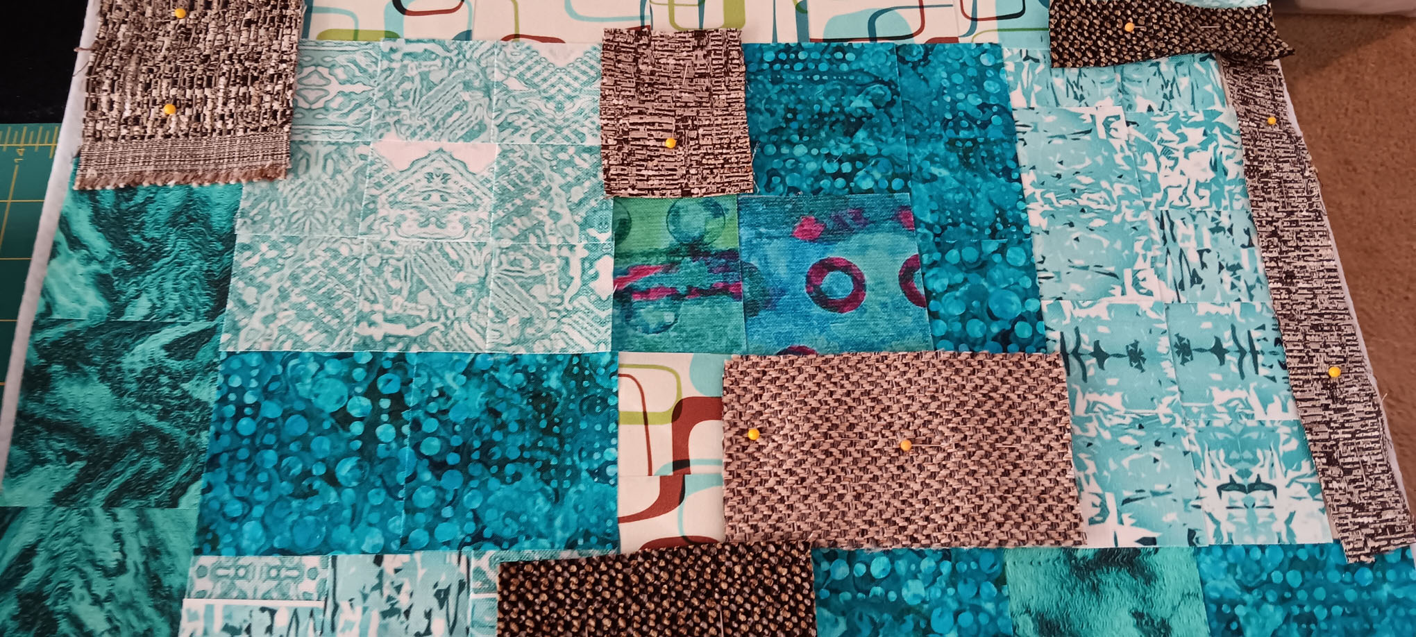 First, I would sew the upholstery piece onto a piece of black Kona fabric. This would serve as a substrate for the upholstery fabric which could then be attached to the overall piece. Sewing around the upholstery fabric creates a nice border. I skip sewing on the fringe as I want this to hang freely.