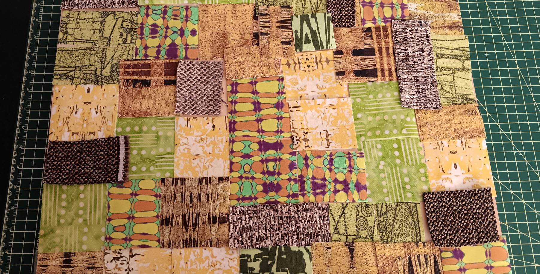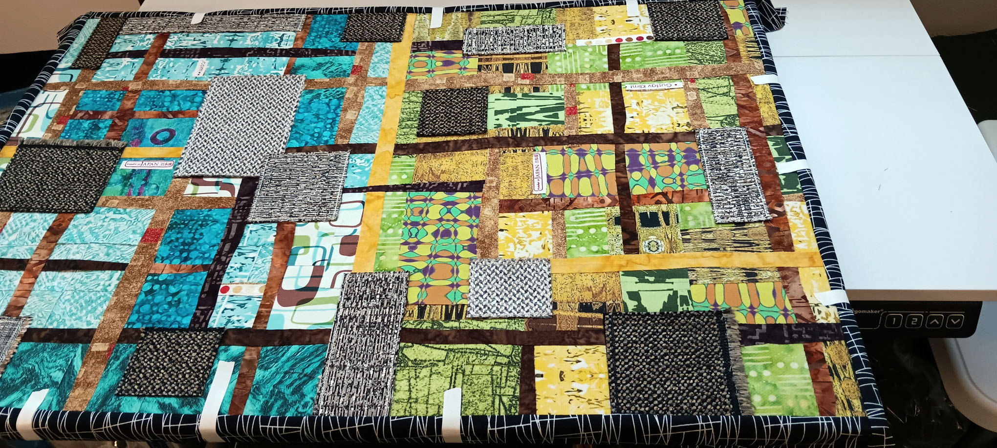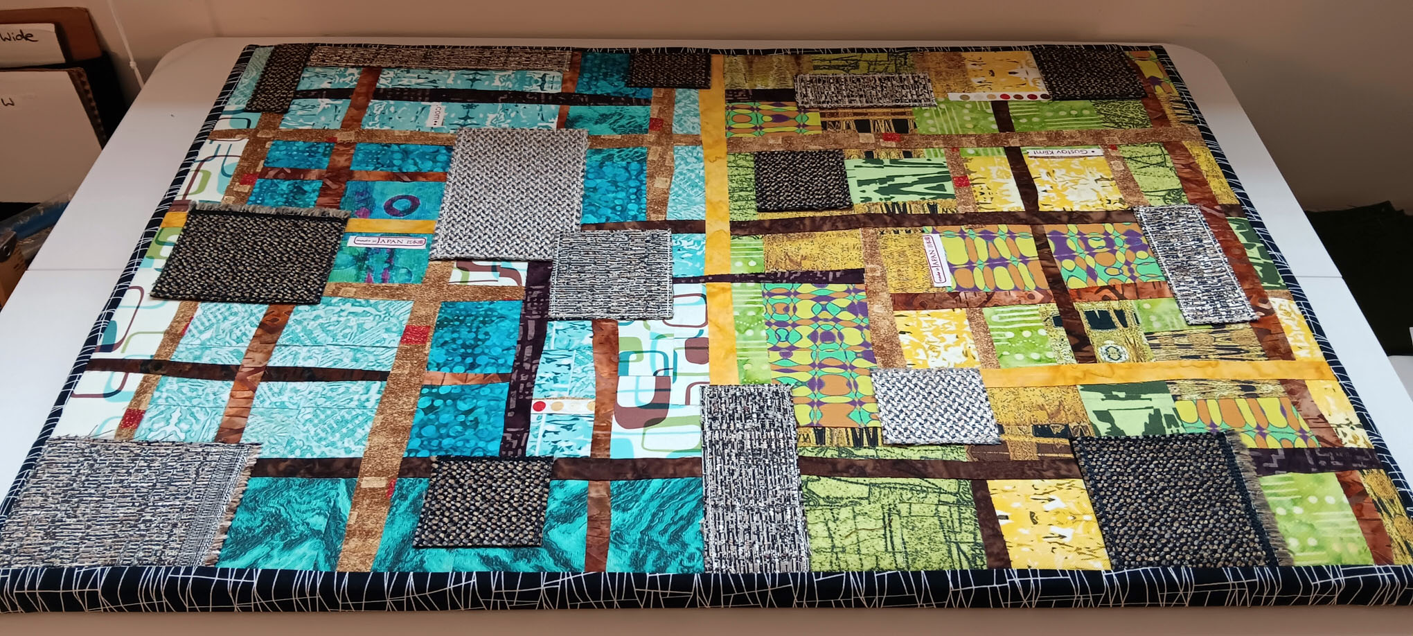 Here is the finished piece with the applique fused onto the top. The rest of the fabric squares are glued down.