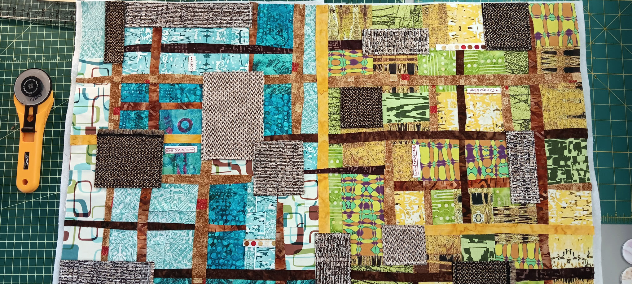 I chose to use lines to lead the viewerโs eye across the piece. These strips weave across the fabric, becoming intertwinements that bind the piece together.