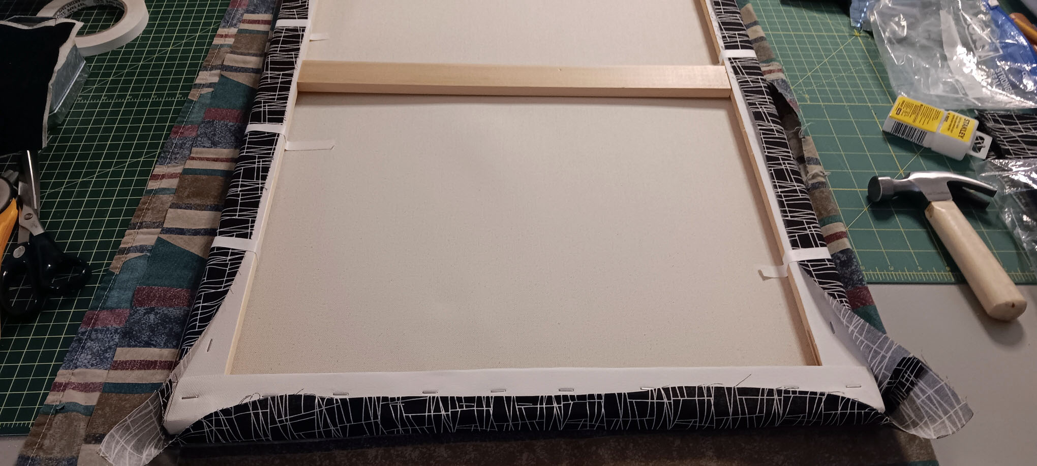 I tape the front of the piece and then wrap the tape around to the back. This helps me move the piece to my larger table. I then use my staple gun to attach the binding to the back of the canvas.