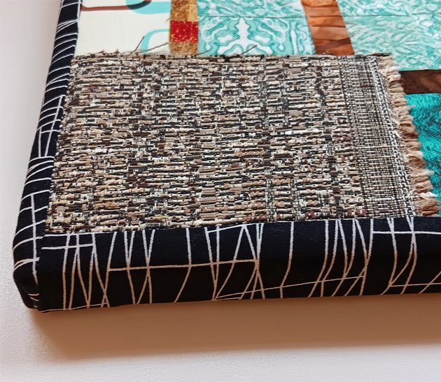 For the binding, I wanted to use extra lines for movement. I trim the piece to fit a 20″ x 30″ stretched canvas. The border is (4) pieces that are 3″ wide. The side borders are attached first and then the top and bottom. The corners are snipped for a better fit around the canvas. I also finger press the seams open for flatter corner seams.